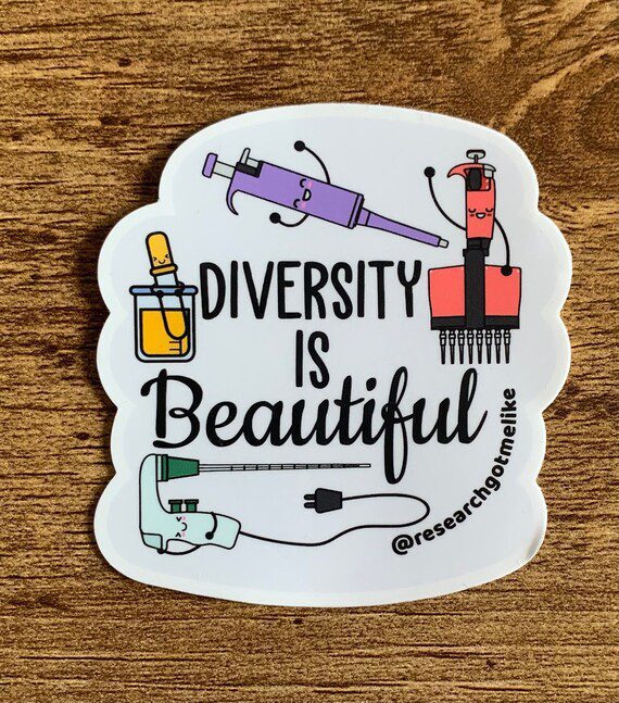 This sticker is the product of an original, hand-drawn design depicting all of the different types of pipettes you can find in a lab. This design serves as a fun reminder that the diversity in academia should be celebrated – so don’t forget to appreciate the unique individuals around you!