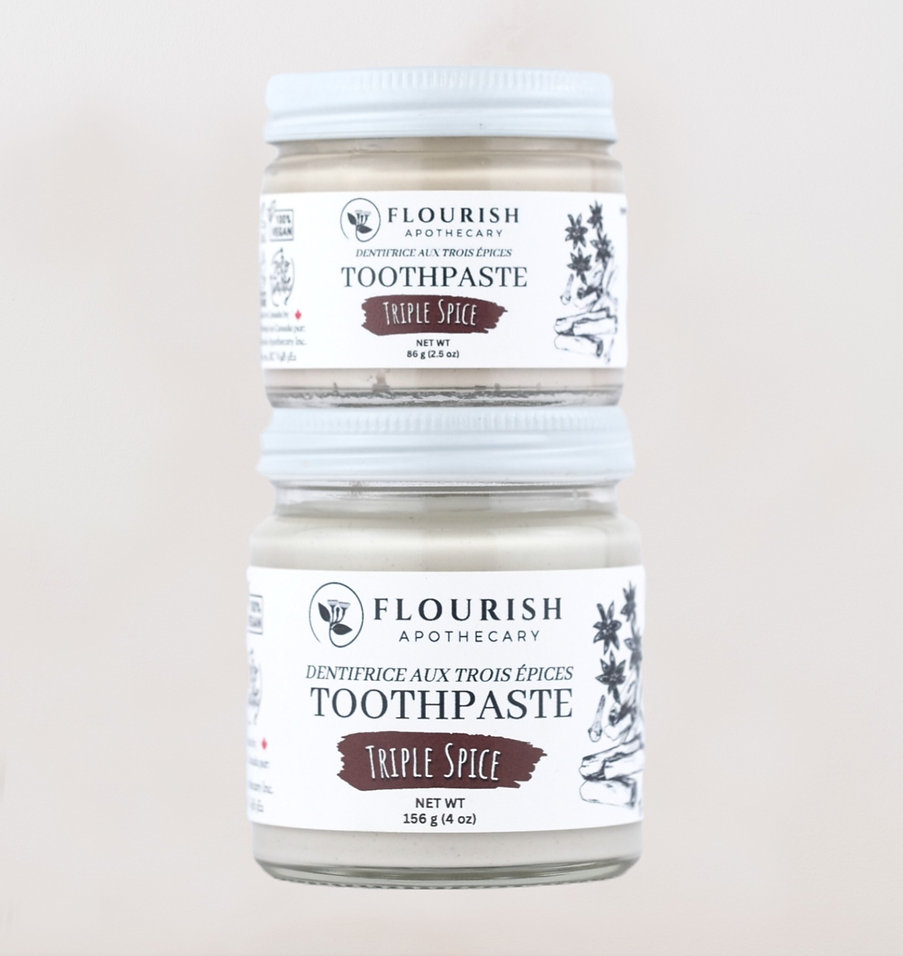Our truly natural, safe-to-swallow toothpaste is made from the highest-quality ingredients, designed to balance your oral pH, protect tooth enamel, and keep gums healthy and beautiful! Our toothpastes are flavoured with 100% organic essential oils, and naturally foam thanks to the addition of locally-produced castile soap. Teeth will feel clean and polished, gums will feel healthy, and breath will feel naturally fresh. Our Triple Spice Toothpaste features a truly tingly flavour burst of cinnamon, cloves, and star anise.