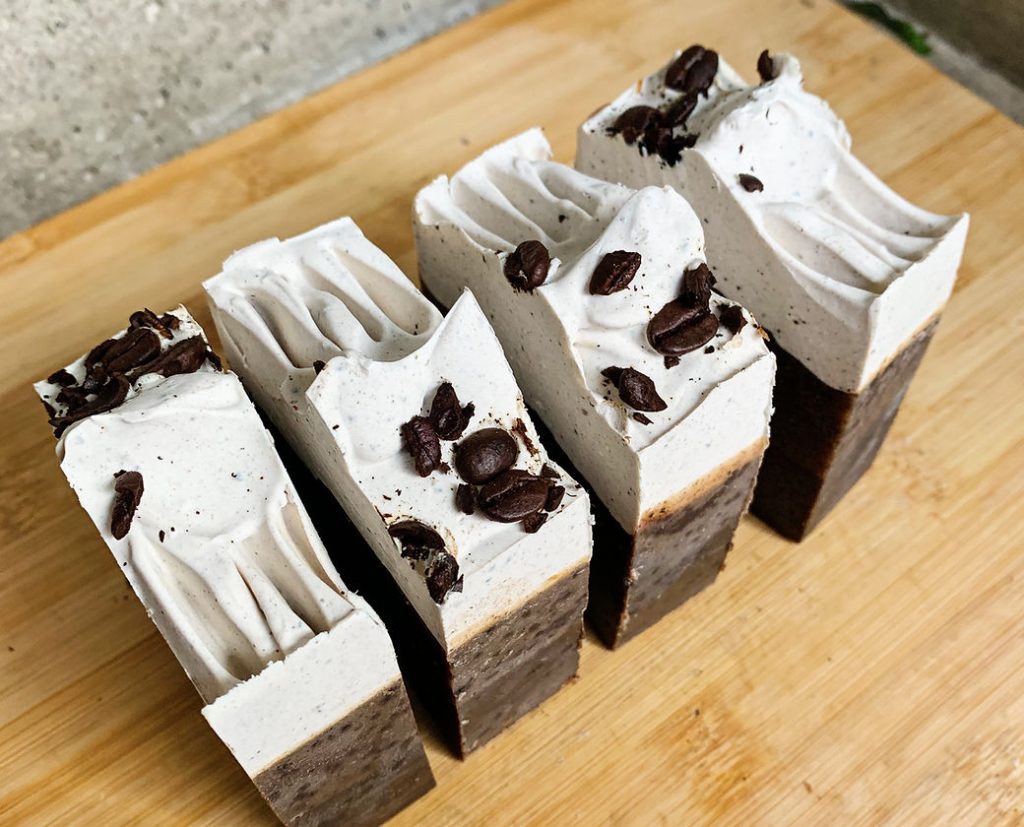 Flat White is one of our favourite soap bars to create with all you coffee lovers in mind. This cleansing and exfoliating body soap is made with lots of coffee: brewed coffee, coffee grounds, coffee infused oils, coffee aromas, and fresh coffee beans on top.