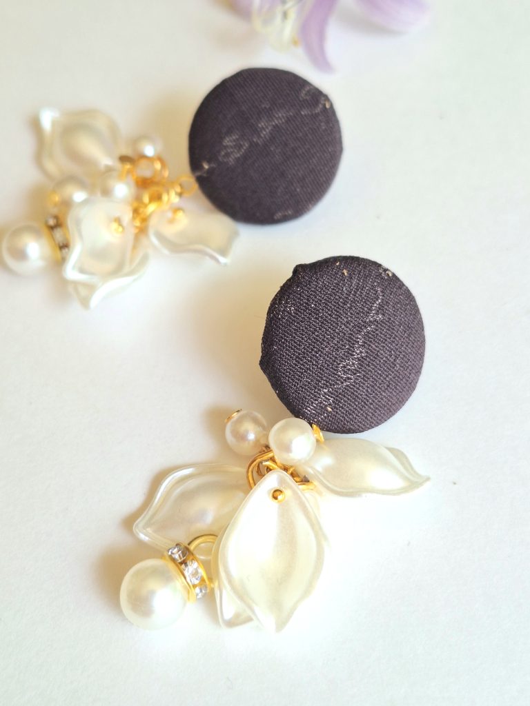 Handmade earrings crafted from authentic vintage kimono fabric, adorned with white petal charms, acrylic pearls, and gold-plated accents.